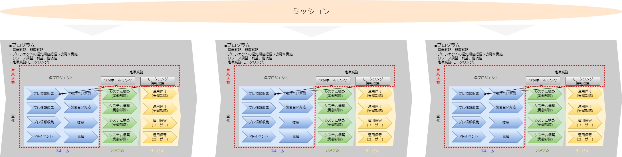 サービス(運用・保守)の構造に別けて捉えることができます。さらに営業活動はシステム、サービスの段階では直接マネジメントするのではなく、モニタリングをしていくという構造になります。このプログラムは、まず、営業戦略、顧客戦略を基に、各プロジェクトの優先順位を見極め、どこに力点を置いて活動するかを判断していきます。この際、システム構築、運用保守の状況をモニタリングし、リソースや継続性を加味した上で、対応を決めていきます。参考: