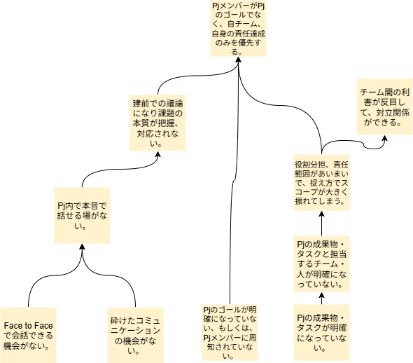 ではなぜ、チームビルディングが上手くいかない事態が発生するのでしょうか?そこには、セクショナリズムや個別最適になってしまうなどが作用していそうな感じがしますが、もう少しロジカルに見ていくため、因果関係を絵にして見てみましょう。