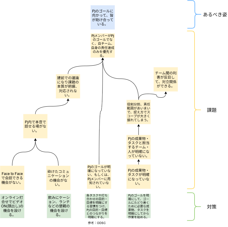 箱と矢印で描いた簡単な図ですが、今、チームビルディングでお悩みをお持ちの方が見たら、きっと、「イヤ、ここの原因は他にある。もっと大きな課題があるはずだ!」など、思い浮かぶのではないでしょうか?