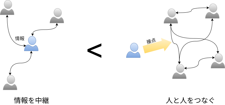 最後にコミュニケーションの機会を作ることについて、もう少し考察してみます。プロジェクトリーダーでなくてもチームビルディングを良好にする振る舞いもできるため、身近な内容かと思います。自分自身が各メンバーとのコミュニケーションを取る機会を取ることは、プロジェクト内で情報が流れていく導線になるため有効です。しかし、それ以上にメンバー同士の接点を作りつなげていく方が、全体としての情報の流れ、連携がスムーズにすることができます。特にメンバー間の関係性が出来上がっていないプロジェクトの初期は、効果的なコミュニケーションになります。すぐには自分の利益になる行為ではないですが、自分がプロジェクトリーダーやチームリーダーでない場合も、このような工夫、努力でプロジェクトに貢献していくことで、サーバント型(奉仕型)のリーダーシップを取っていくのもプロジェクトに建設的に関わる方法の1つかもしれません。